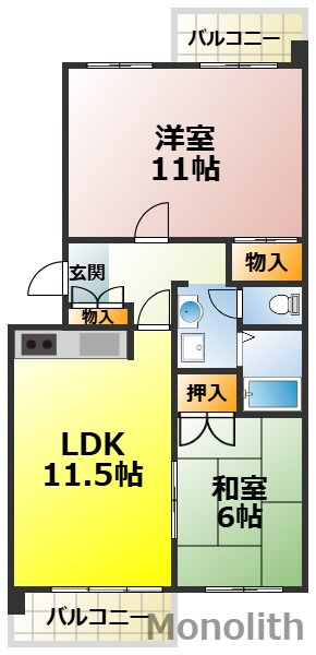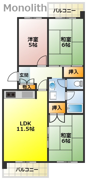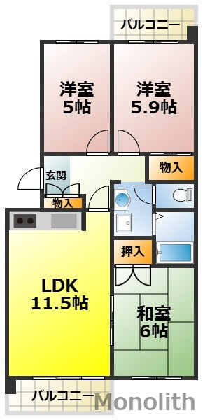 LDK 11.5帖 1室/和室 6.0帖 1室/洋室 6.0帖 1室/洋室 5.0帖 1室 - 向き