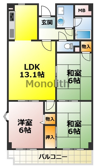 LDK 13.1帖 1室/和室 6.0帖 2室/洋室 6.0帖 1室 - 向き